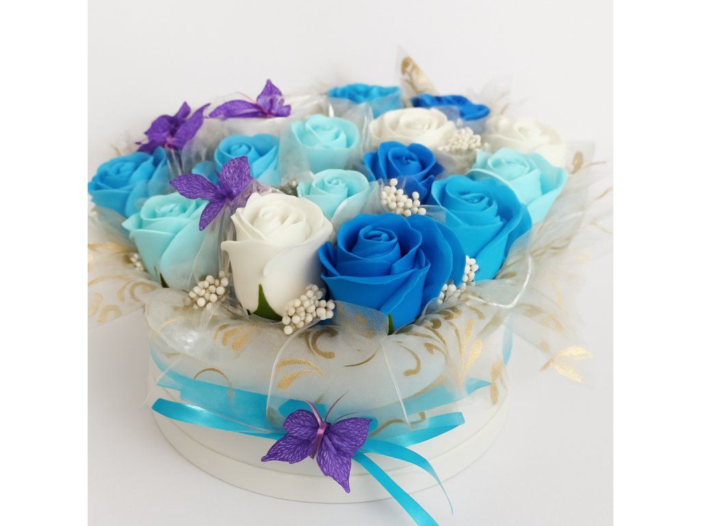 Modrý klenot spojuje noblesu a klid mořských hlubin. Modré, tyrkysové a bílé růže vytvářejí harmonii, kterou podtrhují zlaté detaily a lehké motýlky. Vzniká tak reprezentativní dekorace i výjimečný dárek. Každá růže je parfémovaná originálním francouzským parfémem, který provoní domov po dlouhé měsíce.