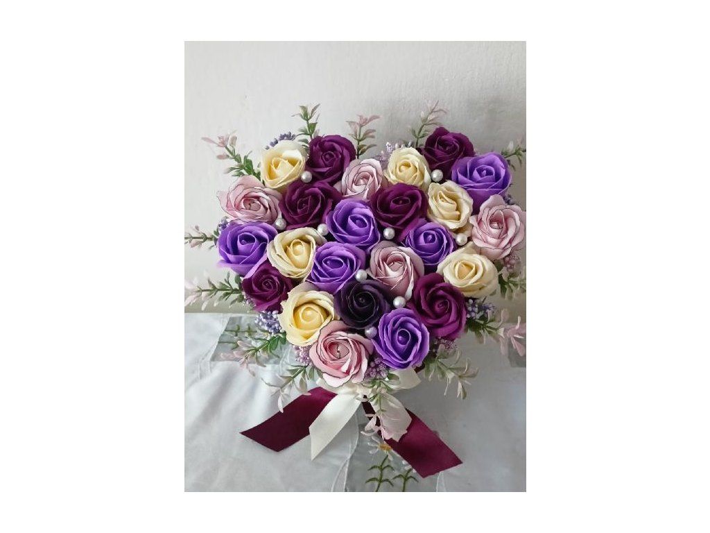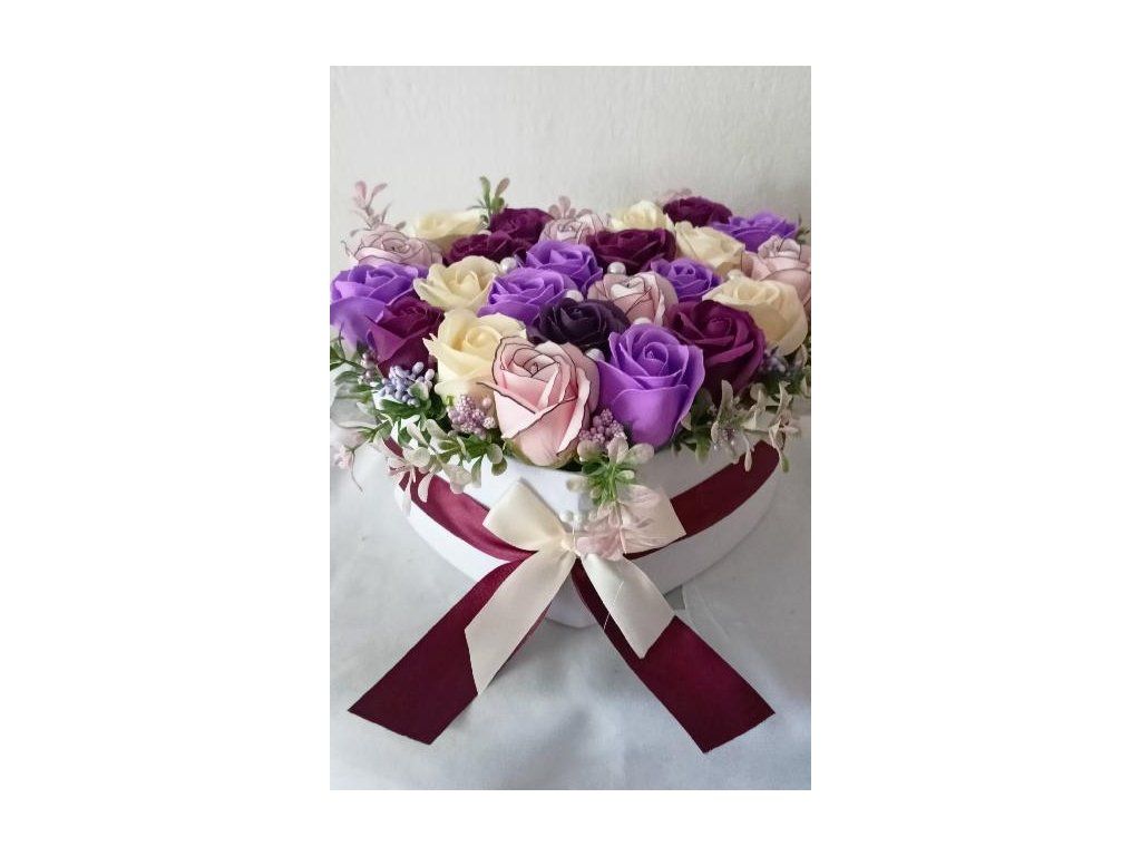 Květinové srdce, které vypráví příběh elegance a harmonie. Kombinace jemně růžových, krémových, levandulových a hluboce fialových růží doplněných o perly a jemnou zeleň vytváří bohatou a působivou kompozici.