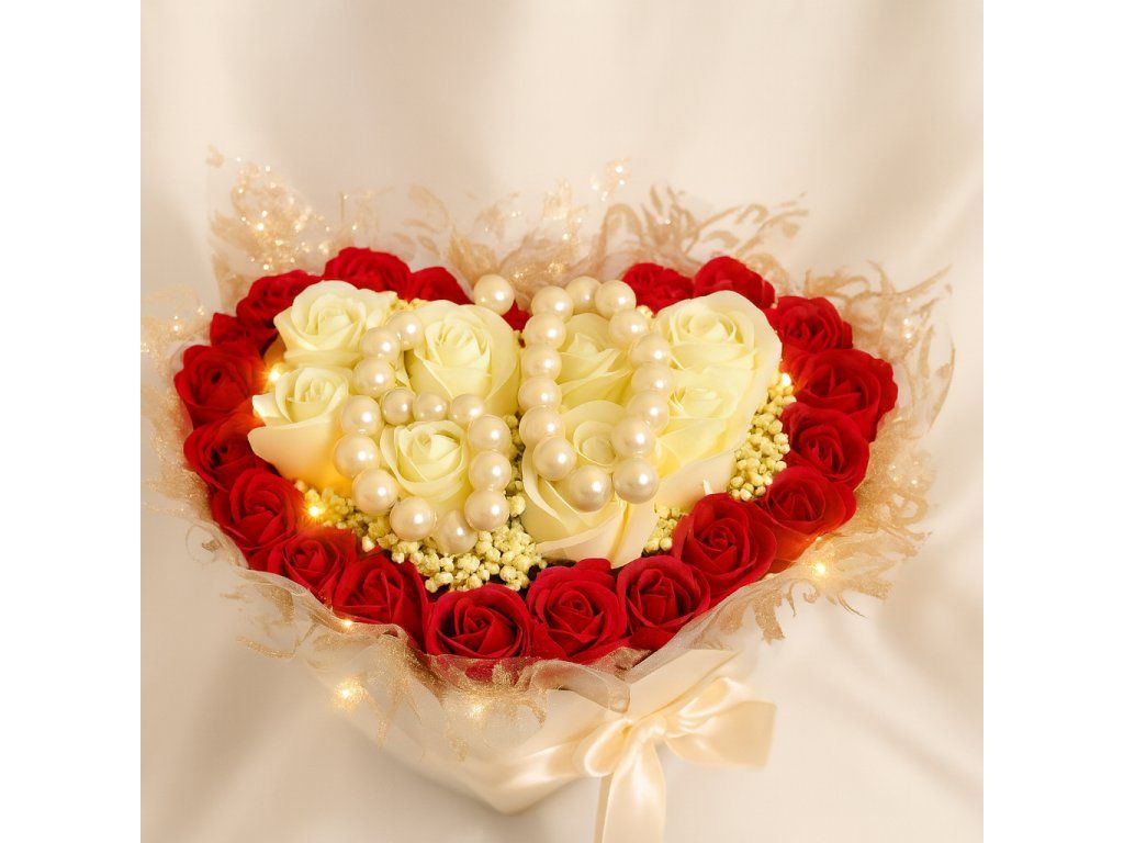 Slavnostní srdce pro kulaté jubileum. Krémové růže jako něha, červené jako vášeň – a perly tvořící „50“ dodají celé aranži noblesu. Skvělý dárek k narozeninám či výročí, který potěší pohledem i vůní.