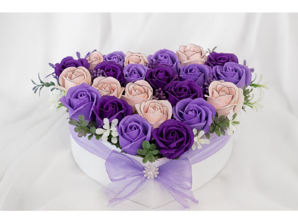 Květinové srdce, které vypráví příběh elegance a harmonie. Kombinace jemně růžových, krémových, levandulových a hluboce fialových růží doplněných o perly a jemnou zeleň vytváří bohatou a působivou kompozici.