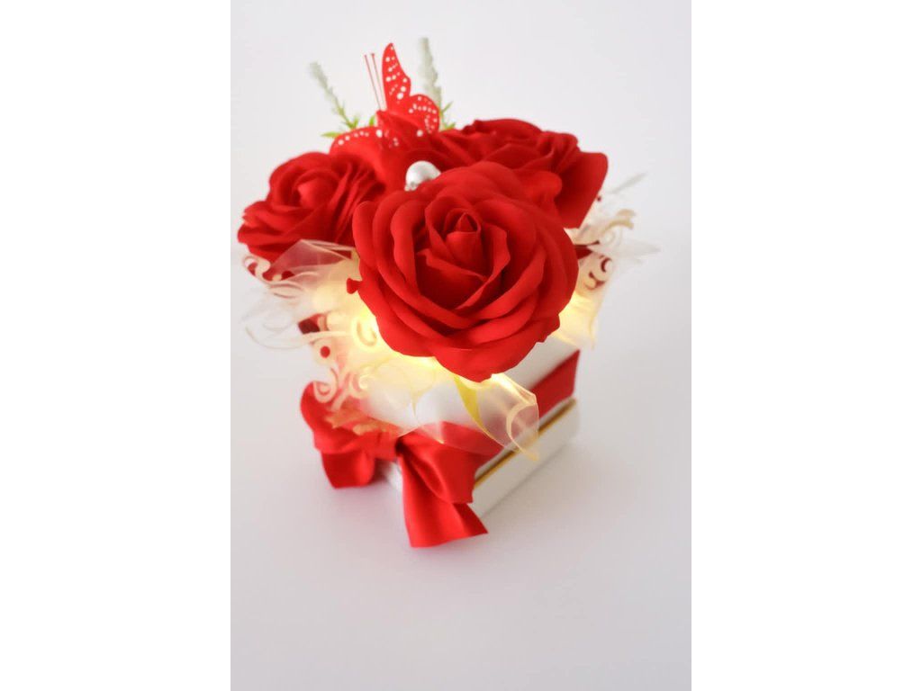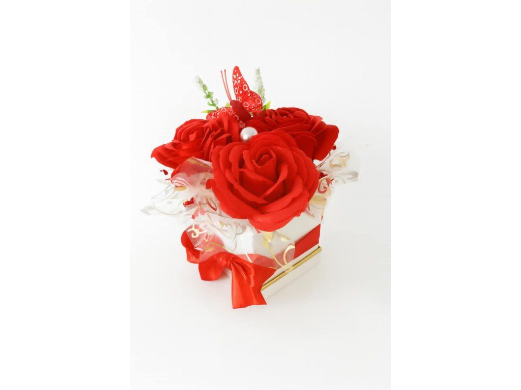 Smyslný mini box s červenými růžemi působí vášnivě a elegantně. Motýlek a perla dodávají dekoraci romantický detail, který z ní činí výjimečný dárek k lásce, výročí či svátku.