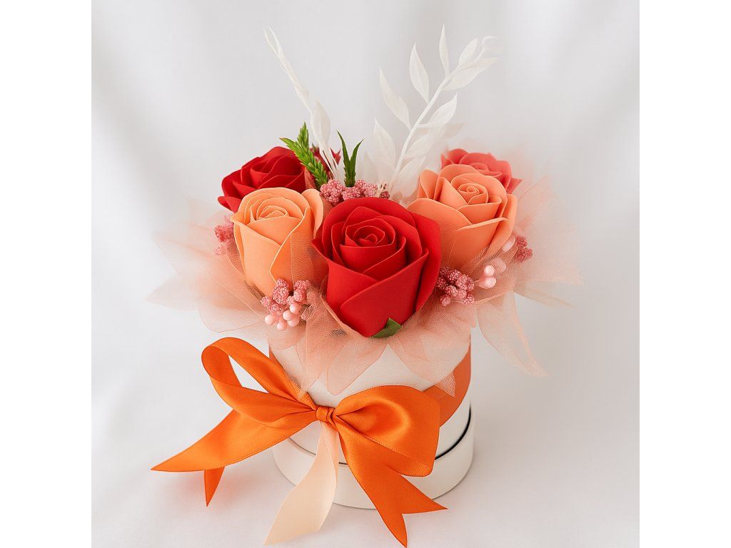 Aria – Ohnivé srdce je symbolem vášně a radosti. Červené a oranžové růže září energií, zatímco bílá dekorace dodává jemnost a rovnováhu. Výrazná oranžová mašle zvýrazňuje slavnostní náladu celého boxu. Tento menší, ale působivý box je dokonalým dárkem, který přinese teplo a úsměv do každého domova. Každá růže je parfémovaná originálním francouzským parfémem, který provoní domov po dlouhé měsíce.