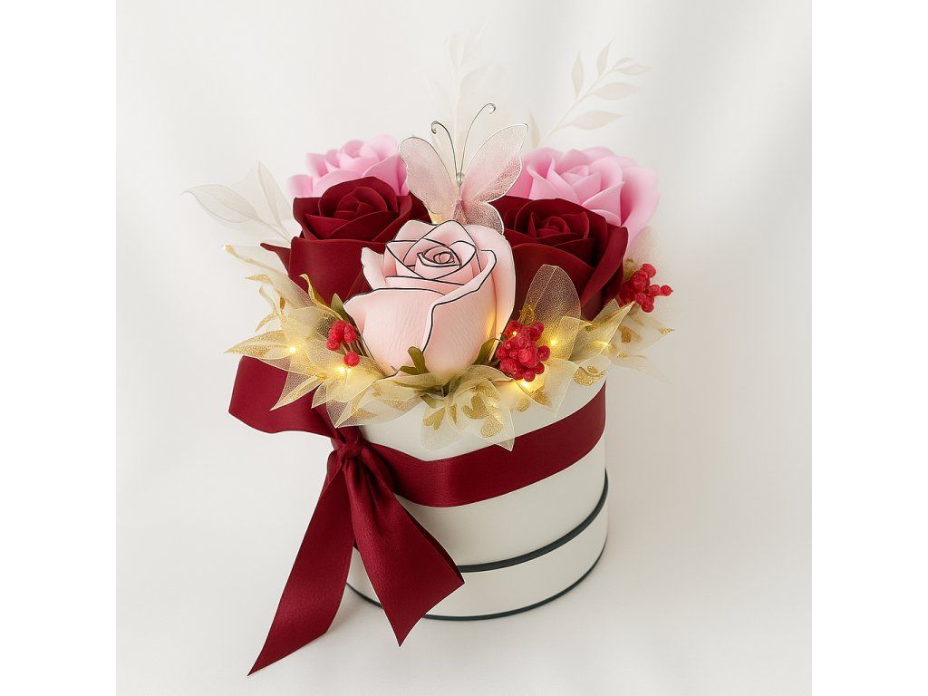 Motýlí světlo je něžné květinové srdce, které propojuje vášeň a romantiku. Syté burgundské a něžně růžové růže rozkvétají v harmonii, zatímco motýlek a LED světýlka dodávají aranži kouzelnou atmosféru. Perfektní volba jako dárek z lásky – k výročí, narozeninám či Valentýnu. Každá růže je parfémovaná originálním francouzským parfémem, který provoní interiér po dlouhé měsíce.