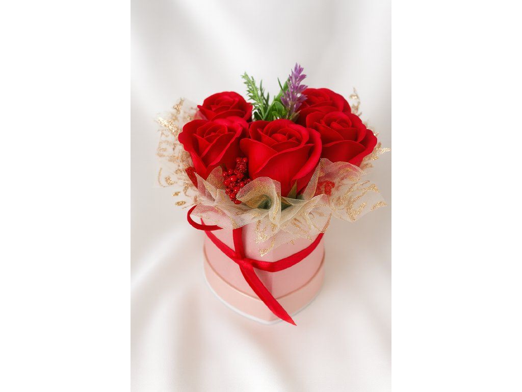 Elegantní srdíčko, ve kterém rozkvétá pět rudých růží, obklopených zlatavým tylem a doplněných drobnými dekoracemi. Červená barva růží symbolizuje lásku, vášeň a oddanost, zatímco zlaté detaily přidávají luxusní a slavnostní dojem. Jemné LED světýlko aranži rozzáří, takže působí okouzlujícím dojmem i v podvečerním světle.