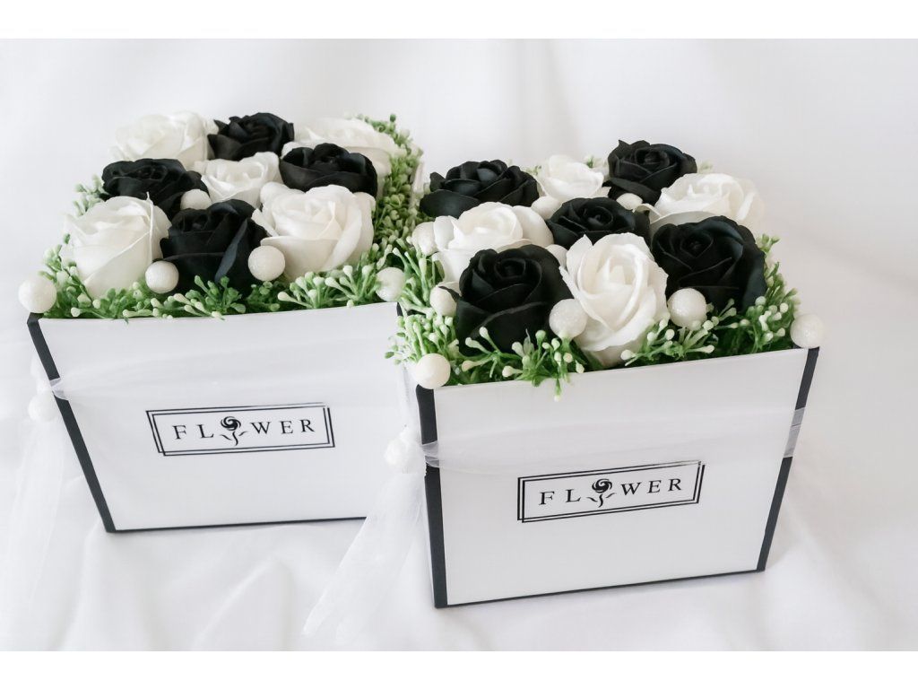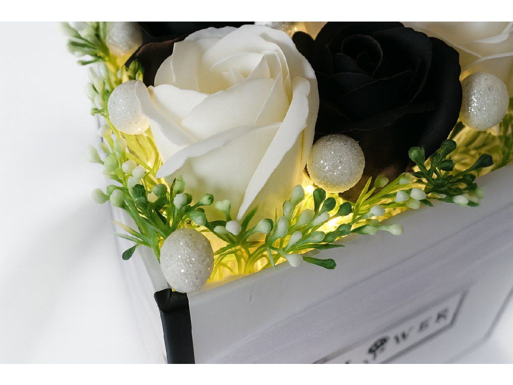 Noir et Blanc – Světelný kontrast je originální aranže, která spojuje eleganci a čistotu v dramatickém černobílém kontrastu. Bílé a černé růže doplněné zelení a perličkami působí výjimečně luxusně, zatímco jemné LED světlo dodává kompozici kouzelný nádech. Hodí se jako dárek i jako moderní dekorace interiéru.