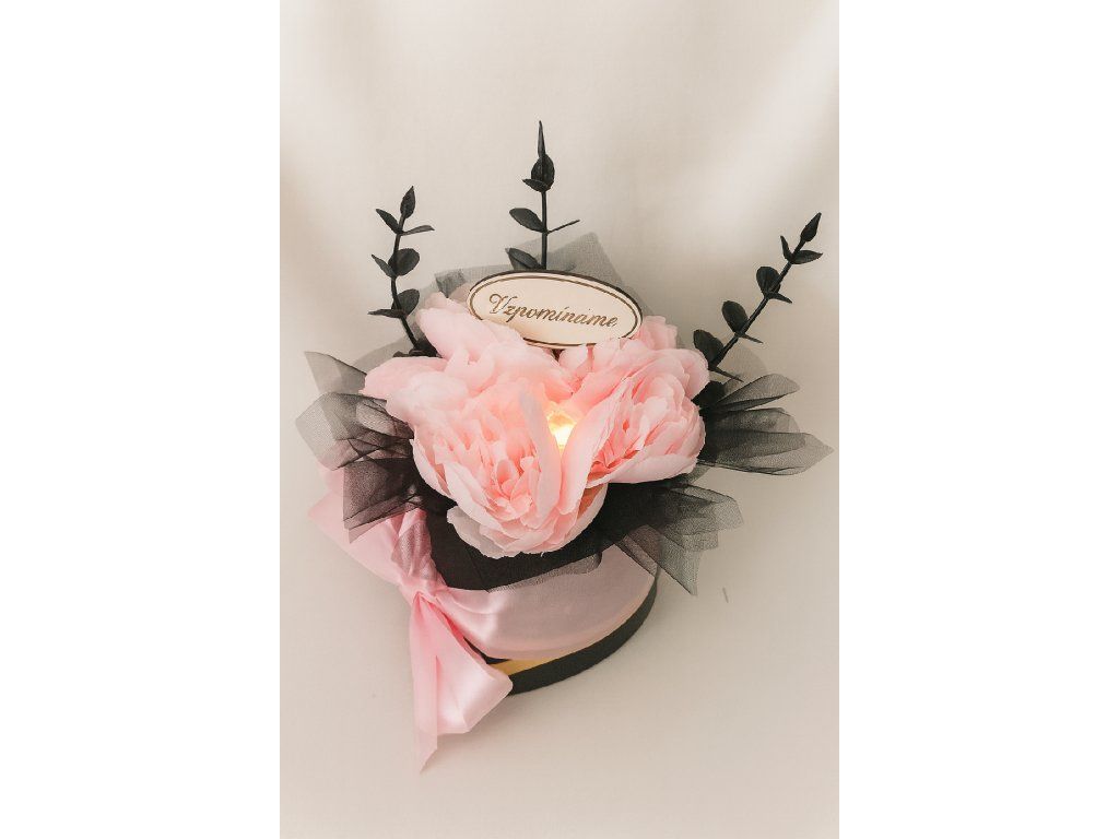 Světlo vzpomínek je něžná a elegantní dekorace, která v sobě spojuje jemnost růžových pivoňkových květů a hloubku černého tylu. Uvnitř ukryté LED světýlko symbolicky prozařuje květ jako vzpomínka, která nikdy neuhasne.