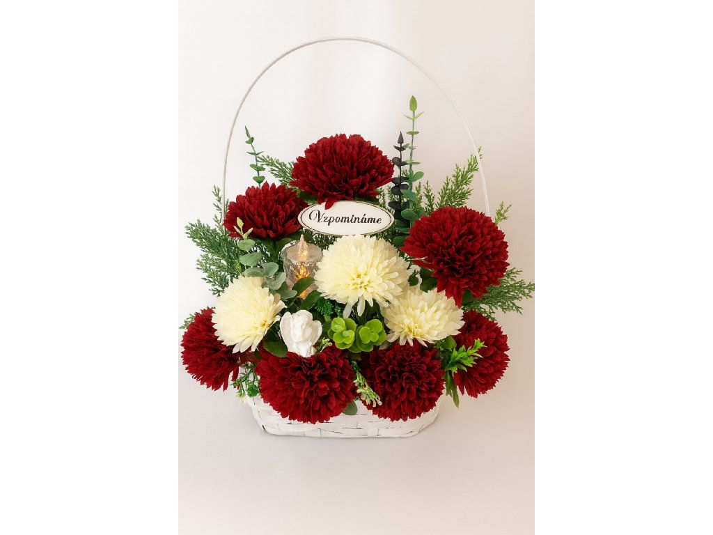 Květinová aranže, která nese poselství lásky a vzpomínek. Vínové a krémové chryzantémy symbolizují věčnost, světýlko a andělíček dodávají aranži jemný duchovní rozměr. Stabilní košík je zatížen dekoračními kamínky, takže bezpečně stojí i ve venkovním prostředí.