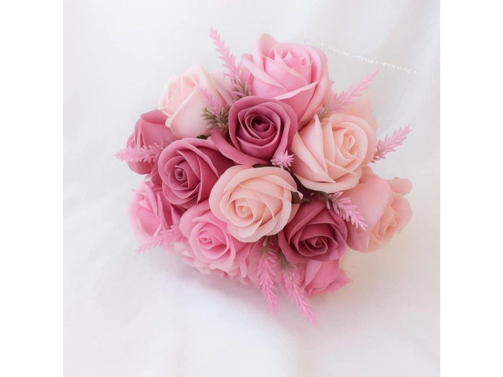 Elegantní a něžná svatební kytice, která nikdy neuvadne. 💕 Růžové odstíny růží symbolizují lásku a romantiku, takže se hodí jak pro nevěstu, tak i pro družičky. Luxusní provedení s decentní manžetou působí slavnostně a zároveň jemně.